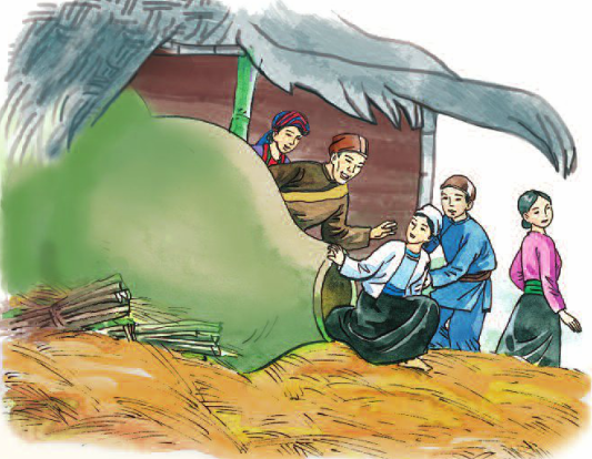 3. Ít lâu sau, người vợ sinh ra một quả bầu. Thấy chồng buồn, chị đem bầu cất lên giàn bếp.